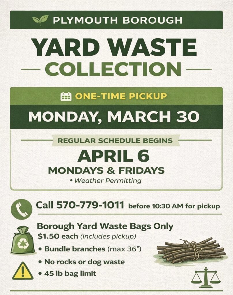 Plymouth Borough will be conducting a special yard waste pickup on Monday, March 30.